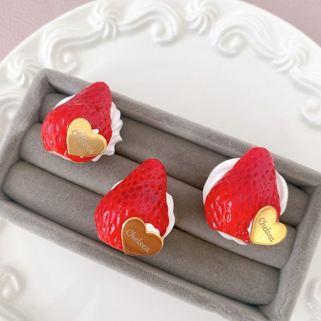 大粒のいちごを使ったリングです♪ ハートのロゴプレートつきです。 いちごケーキショルダーと同じいちごを使用していますので、お揃いもおすすめです! いちごの大きさ 縦約3cm フリーサイズ