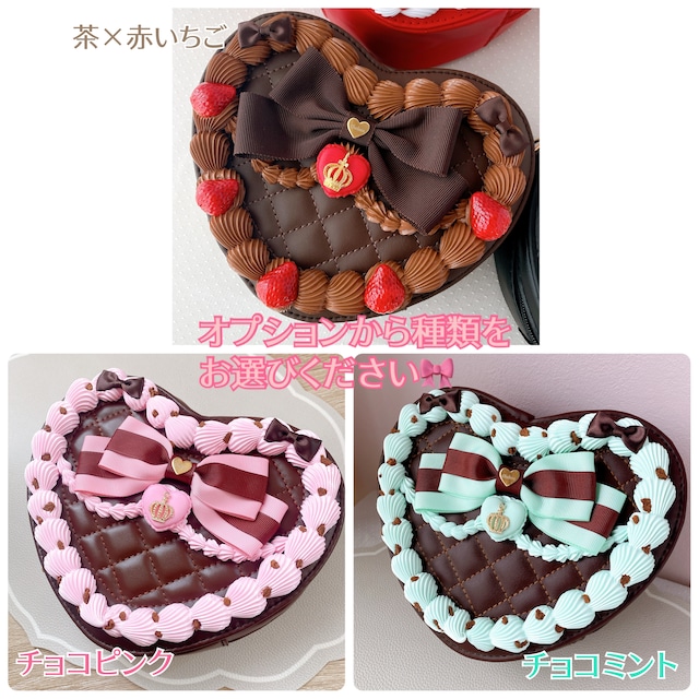 (受注)制作期間 約1ヶ月 こちらはベースのバッグが茶の販売ページです。 オプションから種類をお選びください♪ ※こちらは資材廃番のため在庫がなくなり次第販売終了となります。 後ほどの受注枠の追加はございません。 チョコミント チョコピンク 茶×赤いちご ホイップといちごなどでデコレーションした、ハート型のショルダーバッグです♪ サイズ 横約20cm、縦約17cm、高さ(マチ)約6cm ショルダーベルトの長さ58〜110cm 使用素材について ホイップはシリコン製です。 ぷにぷにとした質感が可愛く耐久性があり、 綺麗なホイップが絞れるためシリコンを使用しております。 素材の性質上、ケーキヘッドドレスなどに使用している粘土製ホイップよりも少し重みがあります。(バッグの重量は約350gほどになります) ハンドメイド品のため、ホイップの形やイチゴの色味に個体差がございます。 イチゴ部分は樹脂粘土を使用しています。 防水コーティングしてありますが、 できるだけ湿気や水気を避けてご使用ください。